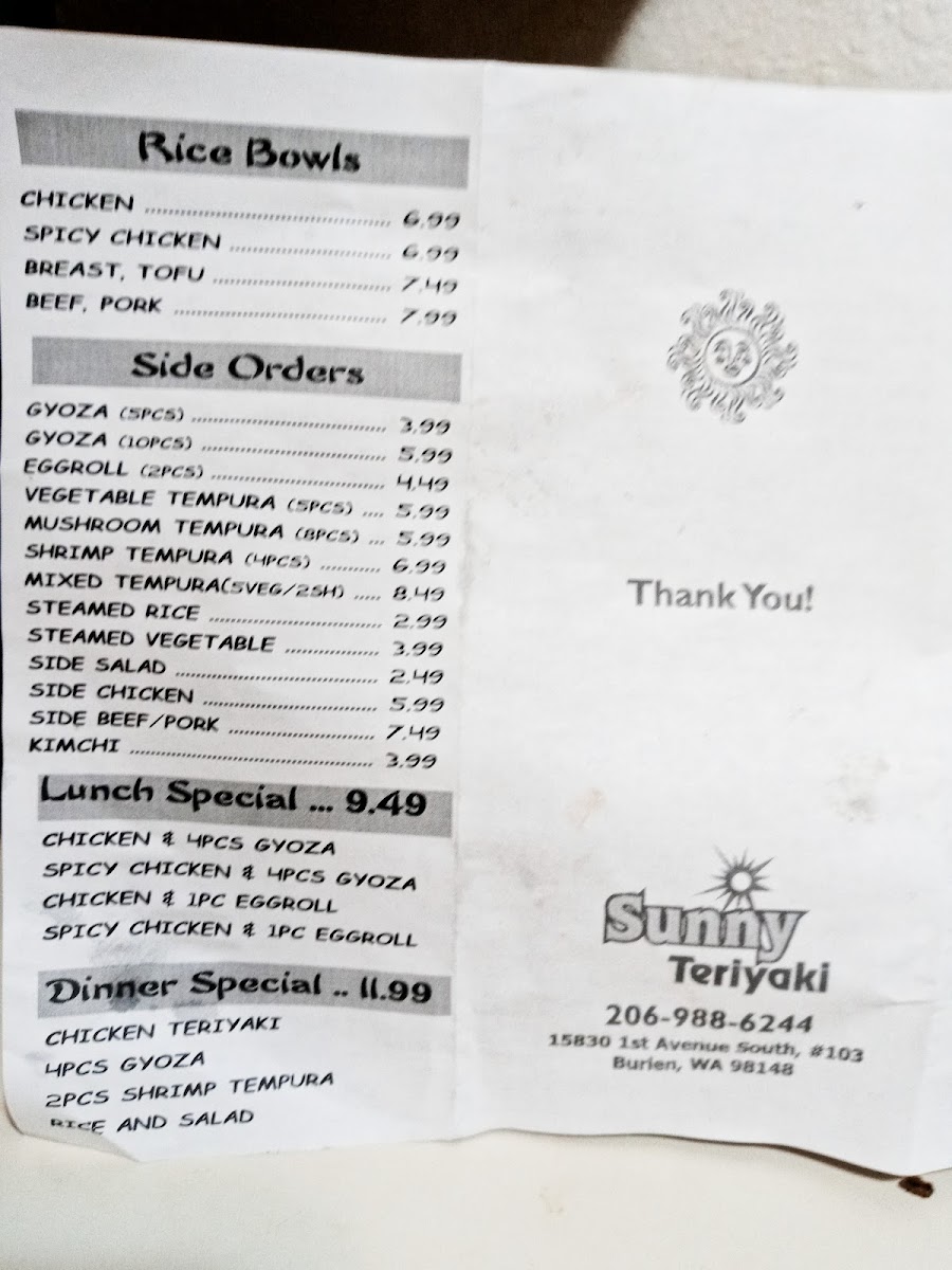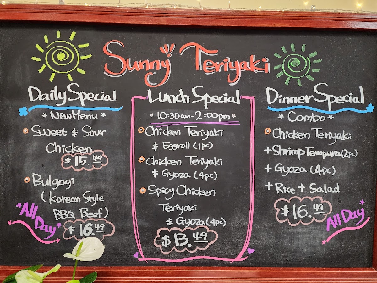 Overall, Sunny Teriyaki’s menu is diverse, catering to different tastes and preferences, with generous portions and reasonably priced options. Whether you’re in the mood for a classic Teriyaki plate, a flavorful Yakisoba, or a satisfying Bento, Sunny Teriyaki has something for everyone.